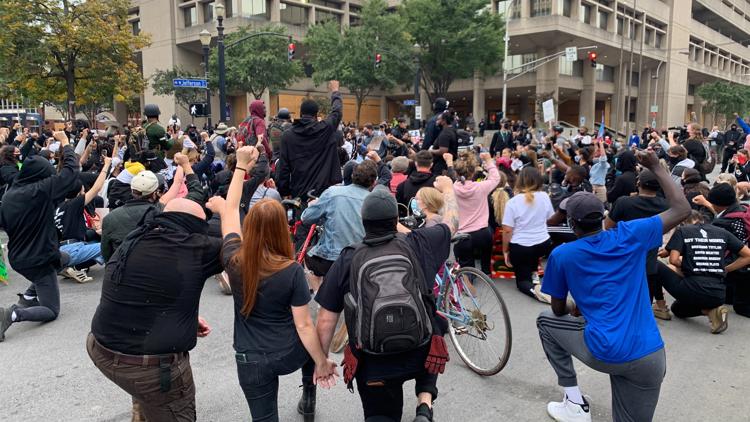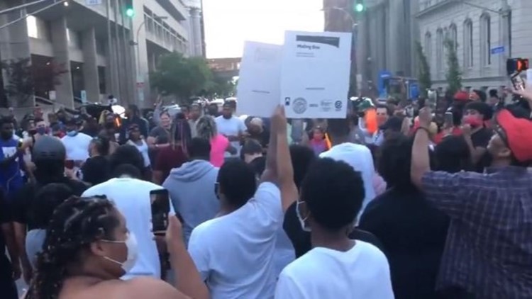 2:45 p.m. After the announcement, a group of protesters at Jefferson Square Park took to the streets in downtown Louisville.